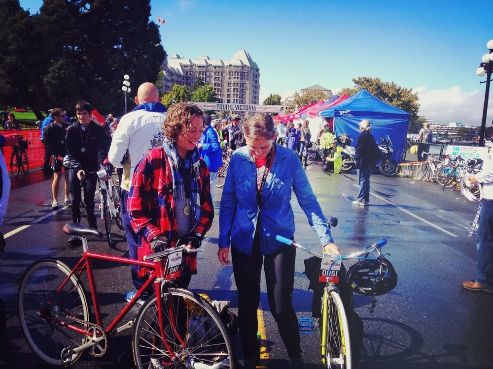 Everyone has a friend like Jessica; whenever you are together chaos and adventure ensue. One minute you are meeting up for a drink and the next thing you know you are passed out on an inflatable dolphin in Mexico. There is a reason why Jessica and I do not hang out all that often: self-preservation. We ran into each other at a barbeque last week and today we crossed the finish line at the Tour de Victoria in the little-known-because-it-does-not-exist category of “Fixed Fifty.” Our victory came with Chuck Taylors so full of water that fish could have lived in them and two fixed gear bikes that didn’t quite fit in. Saying that we were unprepared for this epic event would be an understatement.